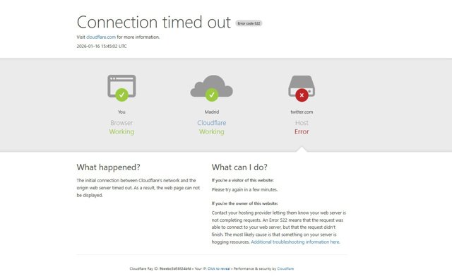 La caída afecta a los usuarios de España, pero tiene alcance global. Al intentar acceder a X en la web, aparece un error 522 que significa que Cloudflare, su proveedor de conexión, está operativo y puede enviar solicitudes al servidor, pero el servidor de X no responde.