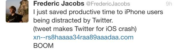 El error, descubierto por el usuario @CPVideoMaker, parece estar relacionado con una URL que utiliza la codificación "punycode", según ha informado The Next Web. Aquí tenéis un ejemplo de uno de los 'tuits' que provocaban el fallo de la 'app' en iOS: