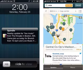 Spindle lanzó una aplicación de búsqueda móvil en la que a través de las redes sociales como Facebook y Twitter, se publican los puntos de interés como restaurantes o tiendas en base a los 'tuits', ubicación y hora del día. Es una manera de perfeccionar la experiencia de descubrimiento local desde el dispositivo móvil.