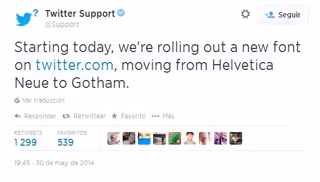 Twitter ha anunciado el cambio de la fuente tipográfica de su servicio web. La compañía ha decidido sustituir el diseño habitual de su tipografía, que era Helvetica Neue, y apostar por una nueva, denominada Gotham. La nueva tipografía ya se puede ver en el servicio.