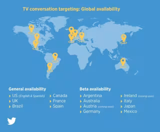 La red social Twitter ha ampliado el alcance de su herramienta 'TV conversation targeting', que desde hoy llega a Brasil, Canadá, Francia y España. Además, la red social comenzará en unas semanas una prueba beta para llevar el servicio a Argentina, Australia, Alemania, Italia, Japón y México.
