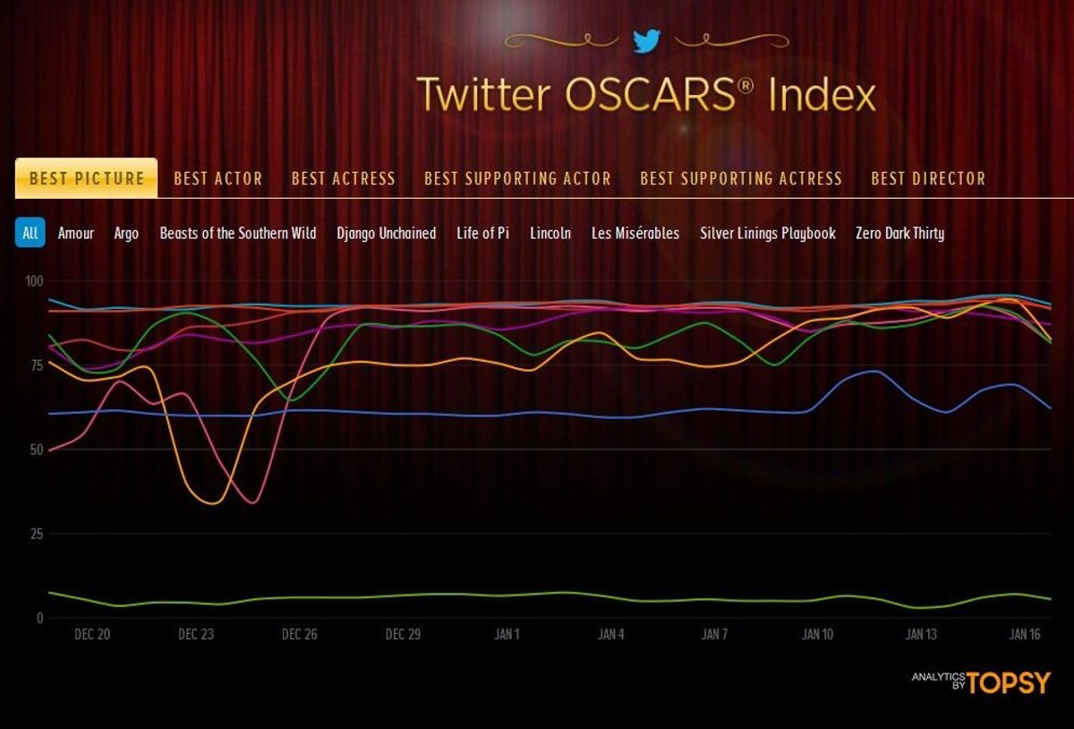 Twitter Oscars Index permite comparar la repercusión de los nominados a seis categorías, entre los que están los de mejor película, mejor actor o mejor actriz entre otros. Los usuarios pueden ver en cada categoría los datos comparados de todos los nominados o limitarse a ver la evolución, por días, de un solo nominado. Se trata de una herramienta útil para ver las impresiones de los usuarios de cara a la entrega de premios.