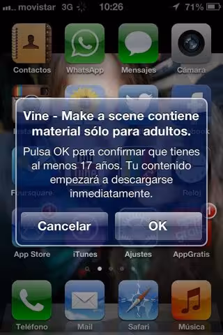 Esta el caso de Vine, Apple no ha retirado la aplicación de su tienda sino que pide a los usuarios a la hora de actualizarla o descargarla que confirmen ser mayores de 17 años.
