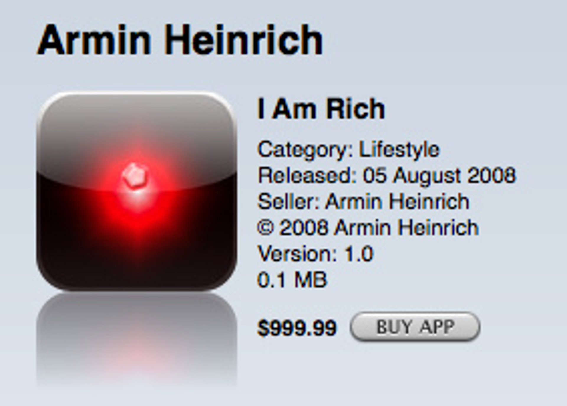 En el mes de agosto de 2008, Armin Heinrich creó una aplicación para iPhone llamada 'Soy rico' ('I am Rich', en inglés). Esta aplicación costaba 799,99 euros en Europa y 999,99 dólares en Estados Unidos, el precio máximo que Apple permite aplicar a sus aplicaciones en el App Store.