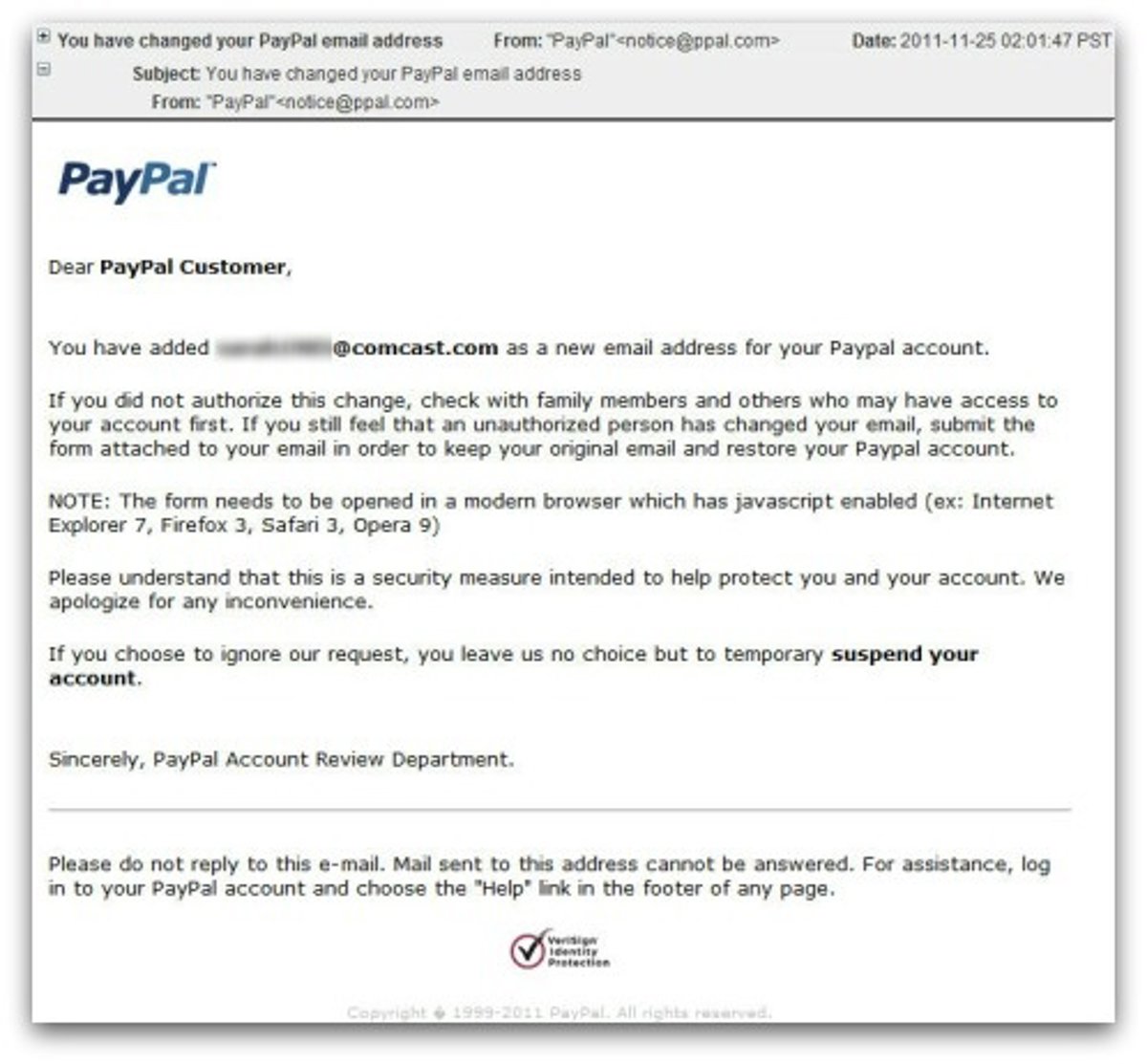 Los ciberdelincuentes se suelen valer de amenazas de cierre de cuentas o de fallos de seguridad ficticios para meter presión a los usuarios y que faciliten sus datos o accedan a archivos infectados con malware. En el caso de 'phishing' de PayPal también han seguido estas estrategias. Los cibercriminales han enviado un correo a usuarios de PayPal, publicado en el blog de seguridad Naked Security, en el que aseguran que se ha añadido una nueva dirección a su perfil para utilizar su cuenta y que deben confirmar que aceptan su uso.