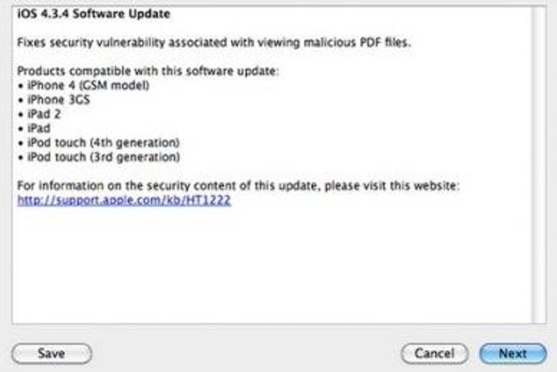 Apple no ha tardado en solucionar el agujero de seguridad y apenas 10 días después ha lanzado una actualización de iOS que aparentemente soluciona el problema. Se trata de la versión 4.3.4 y Apple explica en su descripción: "parche de seguridad para vulnerabilidades asociadas al visionado de archivos PDF maliciosos". En la descripción de la actualización no aparecen más novedades.