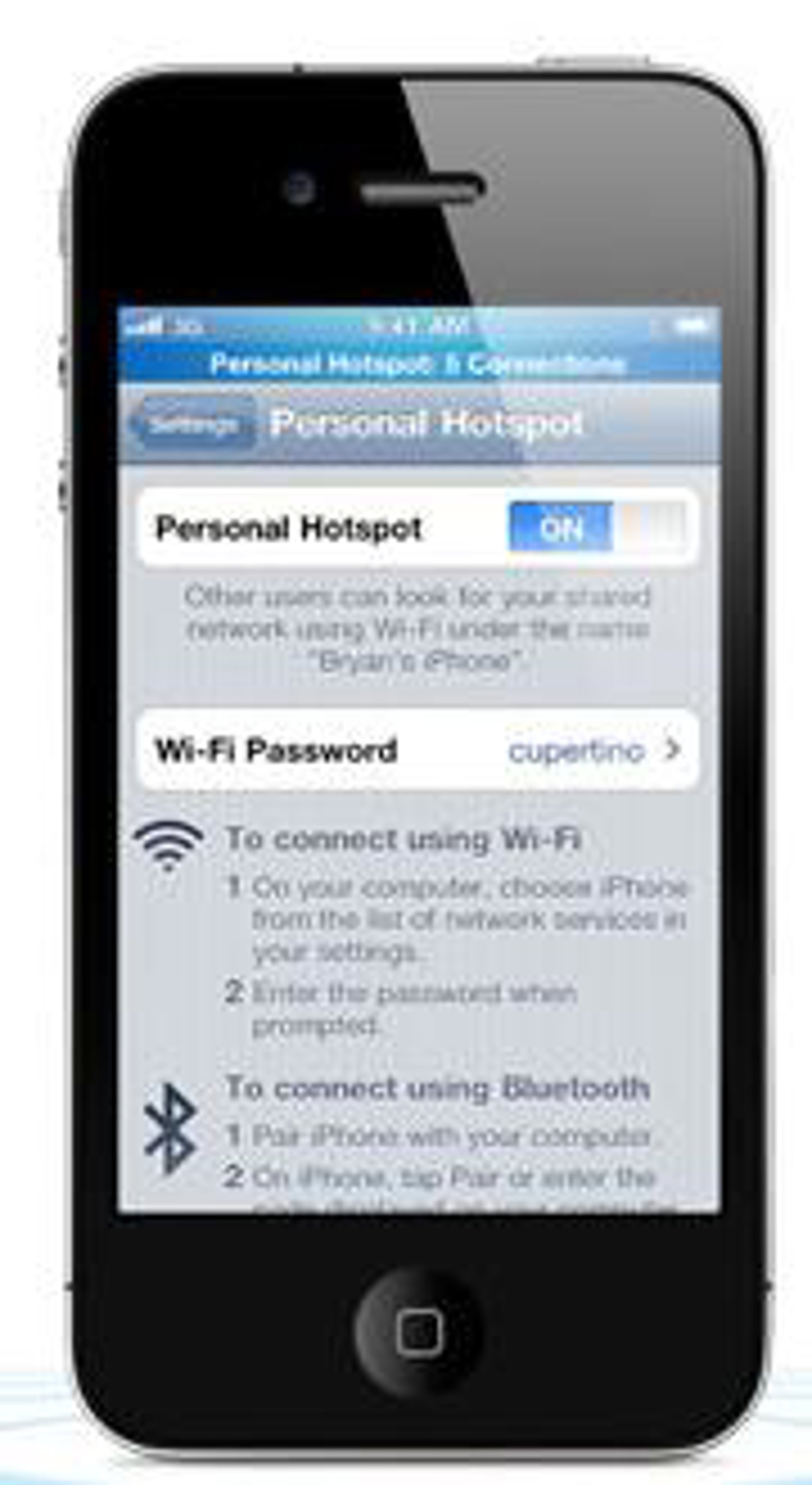 La nueva prestación 'Compartir Internet' de iOS 4.3 mete la Wi-Fi en el bolsillo, al permitir compartir la conexión a la red móvil de datos de un iPhone 4 hasta con cinco dispositivos en una combinación de hasta tres dispositivos Wi-Fi, tres Bluetooth y un USB. Una vez que la prestación está activada, una barra de estado muestra cuántos dispositivos están conectados en ese momento. Todas las conexiones están protegidas por contraseña y, cuando no se está utilizando, Compartir en Internet se apaga automáticamente para ahorrar batería.