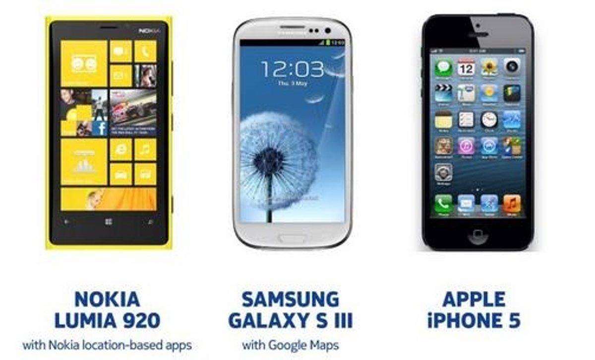 A modo de infografía la compañía finlandesa compara los servicios de localización que ofrecen tanto el Lumia 920, con la aplicación basada en localización propia de Nokia; el Galaxy S III, con Google Maps; y el iPhone 5, con la aplicación Mapas.
