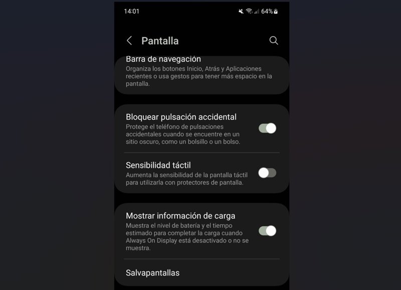 En el caso de Samsung, la capa de personalización de su sistema operativo ha llamado a la misma función 'Bloquear pulsación accidental'. No obstante persigue el mismo objetivo: proteger el teléfono de toques accidentales cuando se encuentra en un sitio oscuro, como un bolsillo o un bolso. Para activarla, dentro de 'Ajustes' se deberá pinchar en 'Pantalla' y, en esta pestaña, activar la opción 'Bloquear pulsación accidental'.