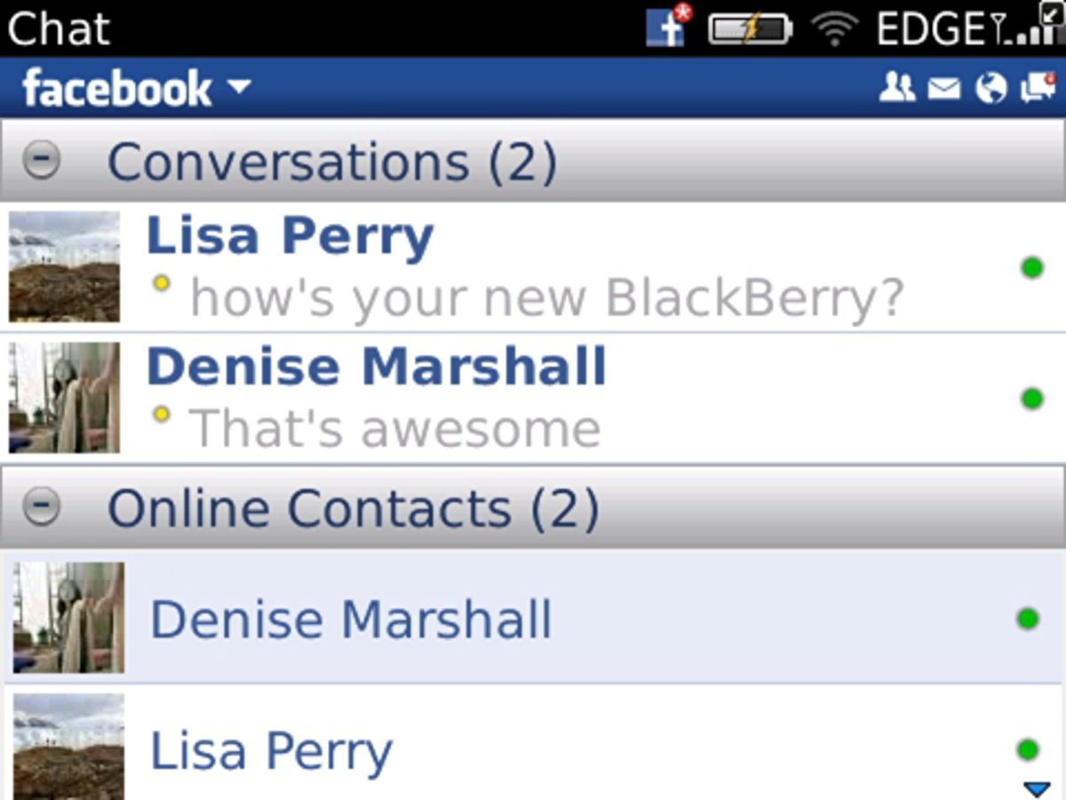 RIM ha lanzado a través de su página BlackBerry Beta Zone, una versión beta de la nueva aplicación de Facebook. Los usuarios pueden descargarla y utilizar los servicios de chats en sus teléfonos. El sistema permite chatear con los contactos de Facebook. Los usuarios solamente deben poner su estado online para que la aplicación les avise cuando reciban un mensaje.