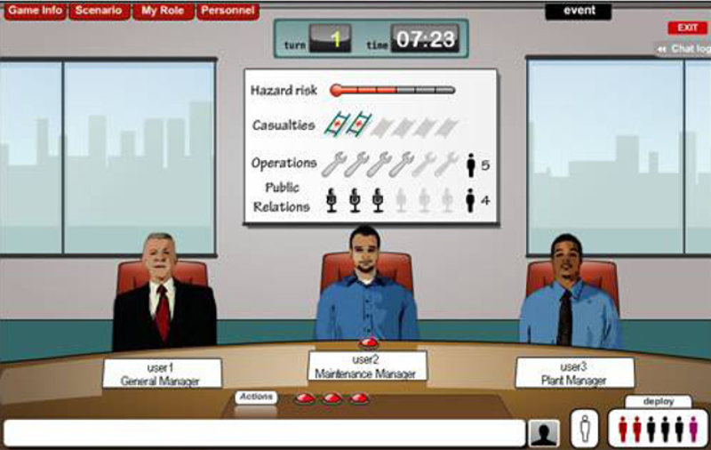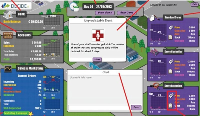 La interfaz del juego permite que un instructor lleve a cabo ejercicios relacionados con la toma de decisiones en el mundo empresarial similares a los que se viven diariamente en el mundo de los negocios.