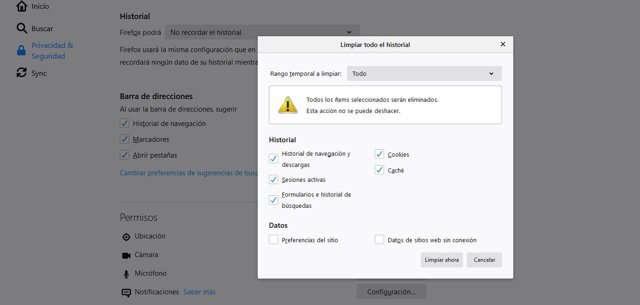 Para borrar este tipo de datos en Firefox, se debe acceder a Menú, historial, limpiar el historial reciente. Aparecerá una ventana donde se podrá seleccionar qué datos eliminar, que son el historial de navegación y descargas, las sesiones activas, los formularios e historial de búsquedas, las 'cookies', el caché, las preferencias del sitio y los datos de sitios web sin conexión. Al igual que en Chrome, se podrá seleccionar desde qué momento se quiere proceder a la eliminación: 'última hora', 'últimas dos horas', 'últimas cuatro horas', 'hoy' y 'todo'.