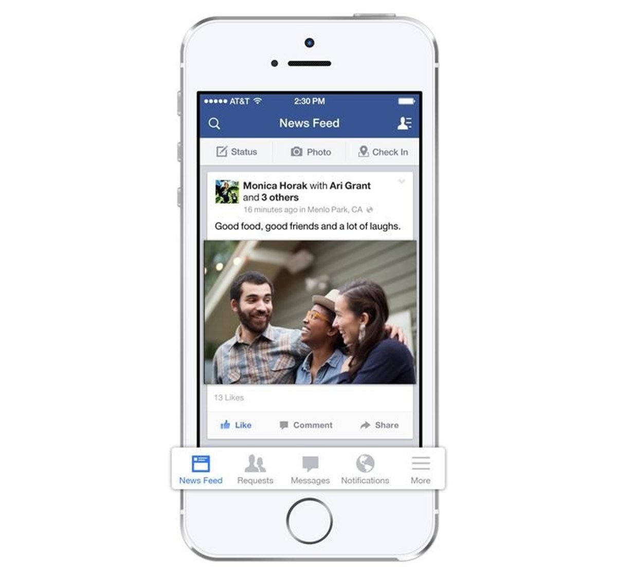La aplicación de la red social de Mark Zuckerberg para iOS cuenta con un diseño en línea con iOS 7. Además incorpora un nuevo menú en la parte inferior de la pantalla que permite a los usuarios "moverse por la plataforma de forma más fácil". Desde este mennú los usuarios podrán acceder a las secciones de Últimas Noticias, Peticiones de amistad, Mensajes y Notificaciones.