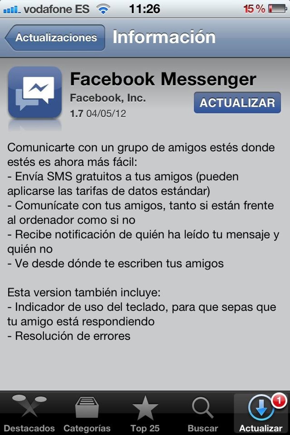 Facebook Messenger se ha actualizado en la versión 1.7.0 incluyendo muchas novedades y dando un paso más para competir con BlackBerry Messenger y WhatsApp. Entre los principales cambios destaca que los usuarios recibirán una notificación indicando si los mensajes enviados han sido leídos. De esta forma, el 'doble check' de WhatsApp es actualmente el único que informa únicamente de si el mensaje ha llegado al destinatario, pero no si ha sido leído. También podrá comunicarse en grupo e informa si el amigo está escribiendo un mensaje, entre otros cambios.