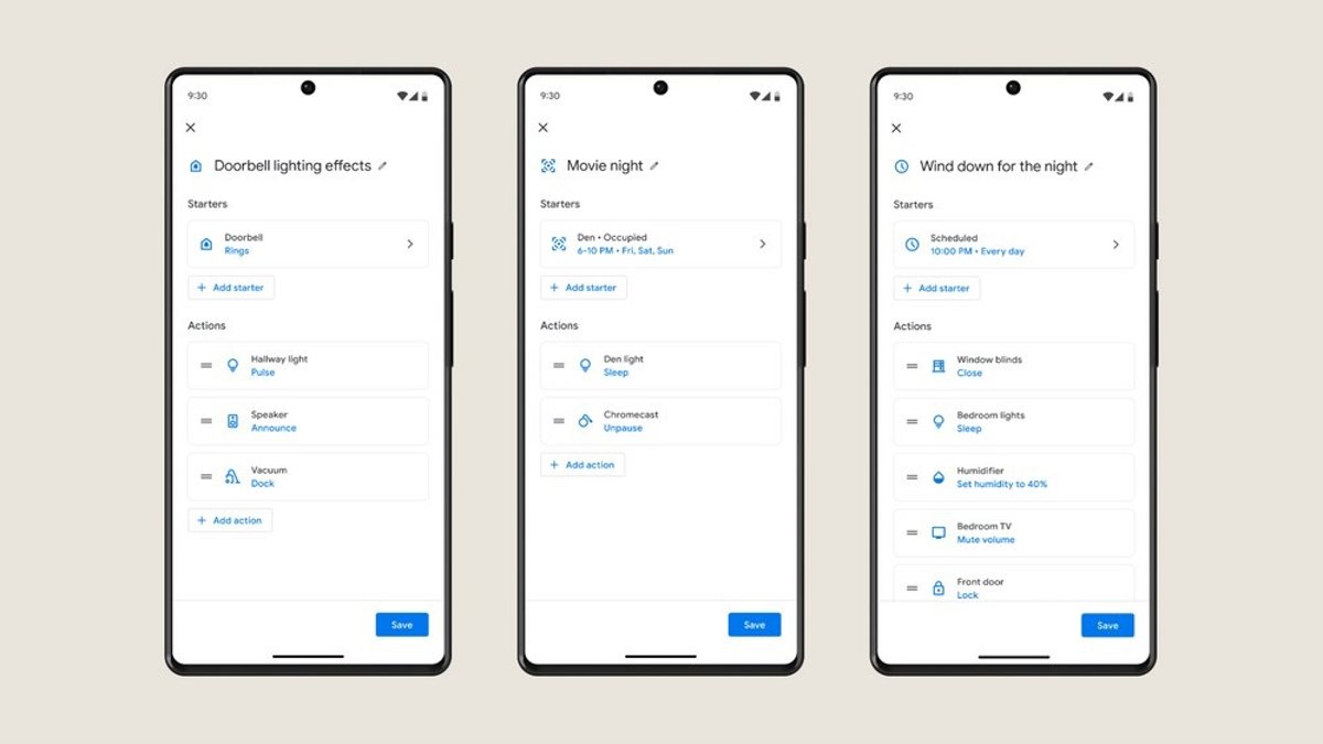 Para ello, la compañía ha anunciado nueve iniciadores -accionadores que permiten que se inicie la rutina- y otras nueve acciones adicionales que, actuando en conjunto, permiten nuevas funciones de gestión. Estas ya están disponibles tanto en la aplicación de Google Home para todos los usuarios, así como en el editor de 'scripts' para usuarios avanzados.