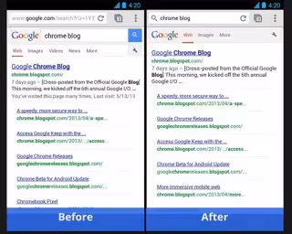 La aplicación de Chrome para Android se rediseña en Android y Apple. En el caso del sistema operativo móvil de los de Mountain View, Chrome hace las búsquedas "más simples" sustituyendo la barra de la URL por la barra de búsquedas de Google (ominibox). De esta forma el aspecto de la página es mucho más limpio.