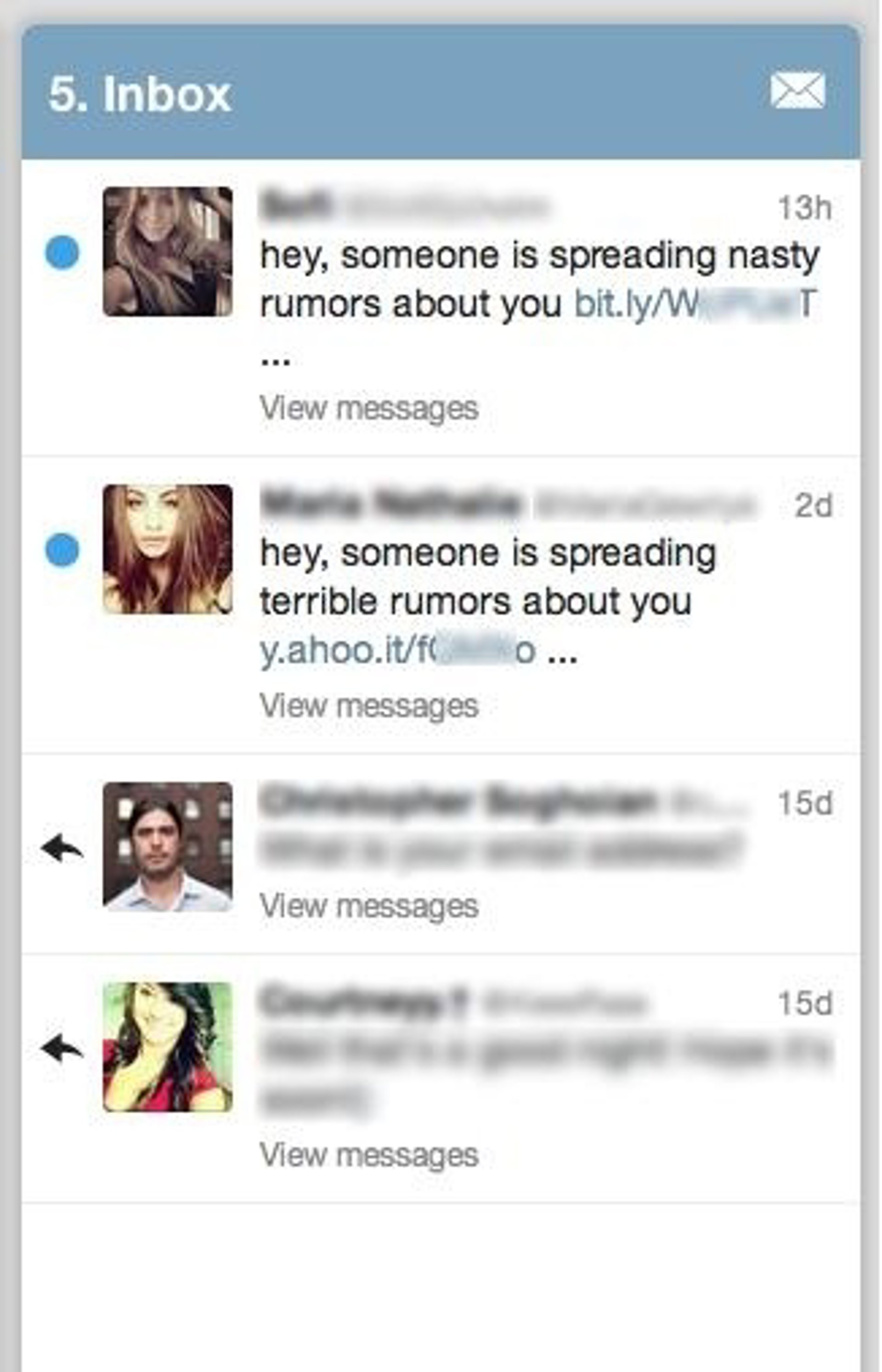 Según alerta la compañía de seguridad Kaspersky, los cibercriminales utilizan esta opción de la red de microbolg para lanzar ataques de 'phising'. Los acortadores de URL utilizados fueron bit.ly y y.ahoo.it y los mensajes que aparecen son: "hey, alguien está propagando rumores desagradables sobre ti (URL)" o "hey, alguien está propagando rumores terribles sobre ti (URL)".
