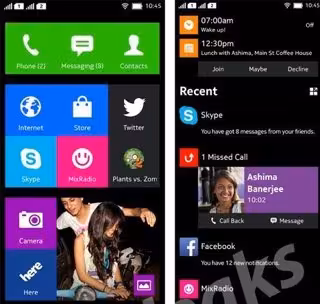 La interfaz de usuario incluye recuadros con iconos que forman un mosaico de colores vivos sobre un fondo negro, con aplicaciones como Skype, Twitter, Vine, Facebook, BlackBerry Messenger o Here, la aplicación de mapas de Nokia. Algunos de estos iconos son idénticos a los que se usan en Windows Phone.