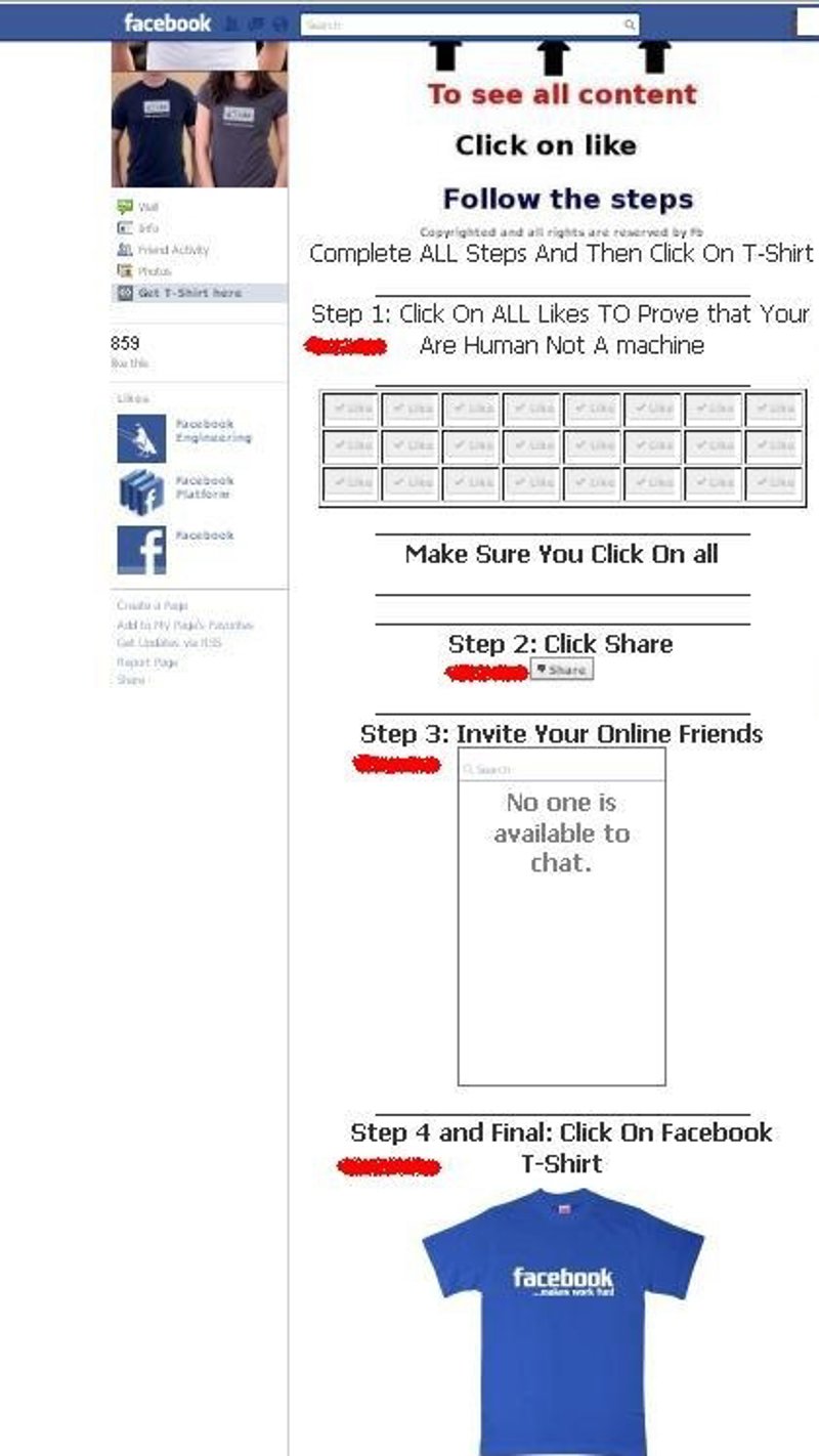 El primer ataque, detectado por la compañía de seguridad BitDefender, prometía regalar una camiseta con el logo de Facebook a las 100.000 primeras personas que se uniesen al grupo creado para promocionar esta prenda en la red social. Para conseguir la camiseta el usuario tendrá que hacer clic en Me gusta a varias páginas. Además, en un último paso se le pedirá su dirección postal para poder recibir la camiseta, de modo que ese dato irá a parar a manos de los ciberdelincuentes.