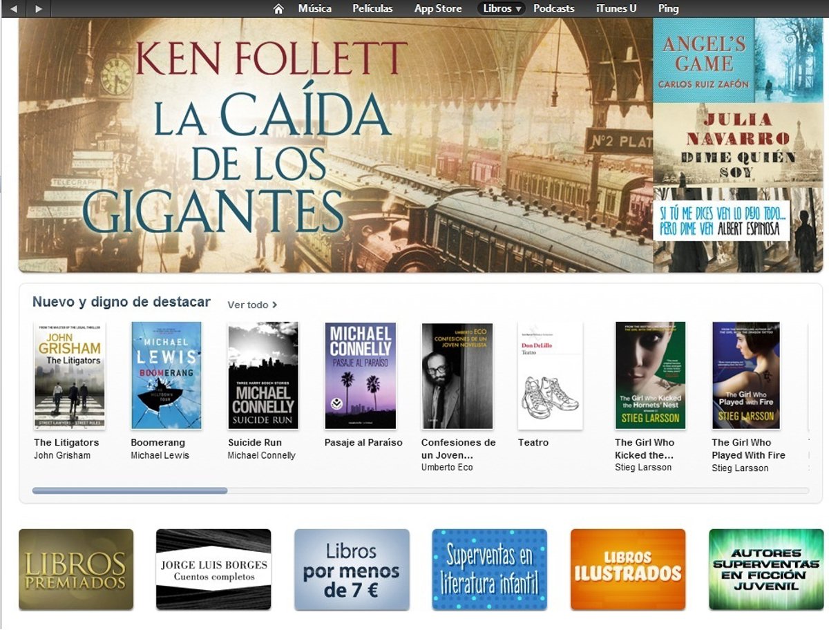 Varias editoriales españolas y latinoamericas como Grupo Planeta, Libranda y Grupo Random House Mondadori acompañan a Apple en el lanzamiento de la iBookstore. De esta forma, los usuarios de iPod Touch, iPhone e iPad disponen de libros electrónicos como 'La sombra del Viento' de Carlos Ruíz Zafón o 'La caída de los gigantes', de Ken Folltet.