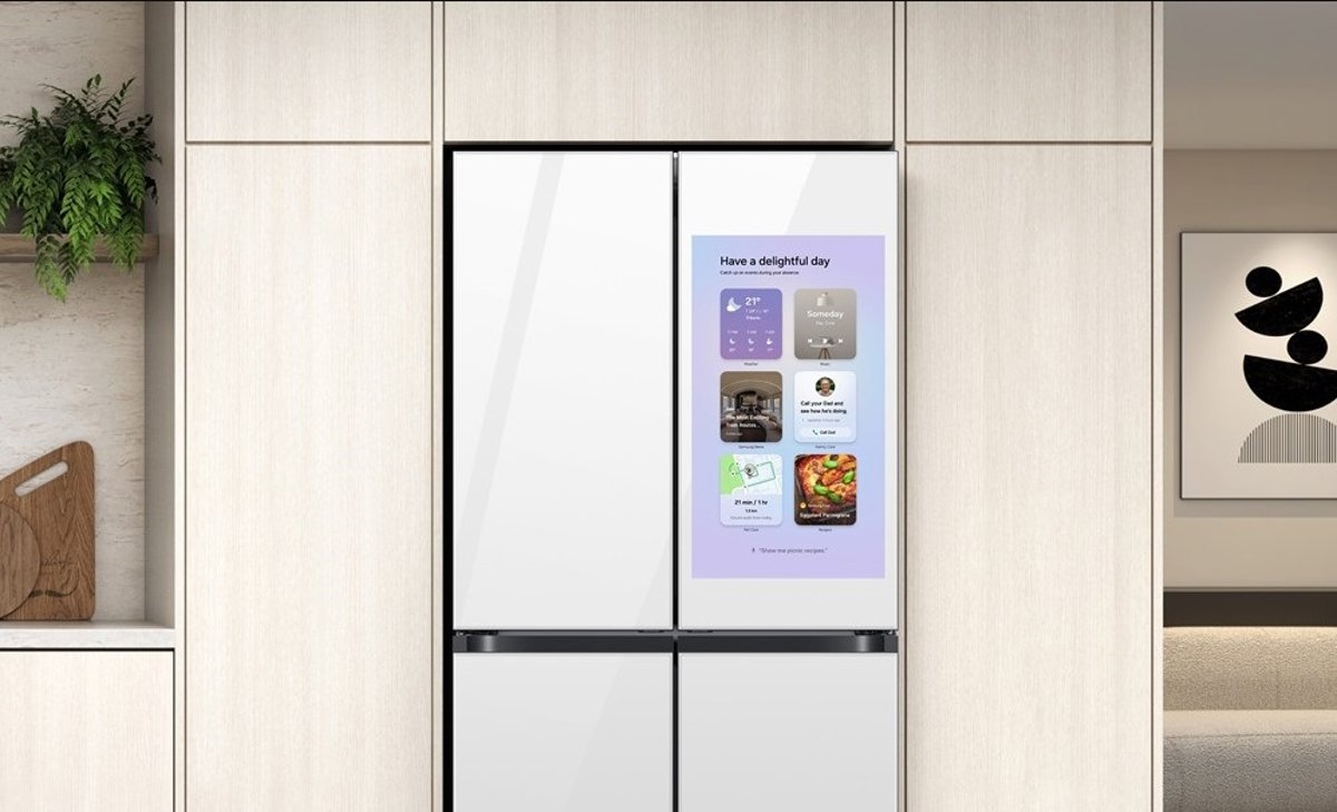 Dentro de la gama de electrodomésticos Bespoke de Samsung, los frigoríficos Family Hub destacan, entre otras cuestiones, por disponer de una pantalla externa AI Home. Esta pantalla ofrece opciones que abarcan desde un centro de control de fácil acceso para el frigorífico y otros electrodomésticos conectados, hasta funciones de entretenimiento y de productividad, como alertas de fechas de caducidad de la comida o listas de la compra, entre otras cuestiones.
