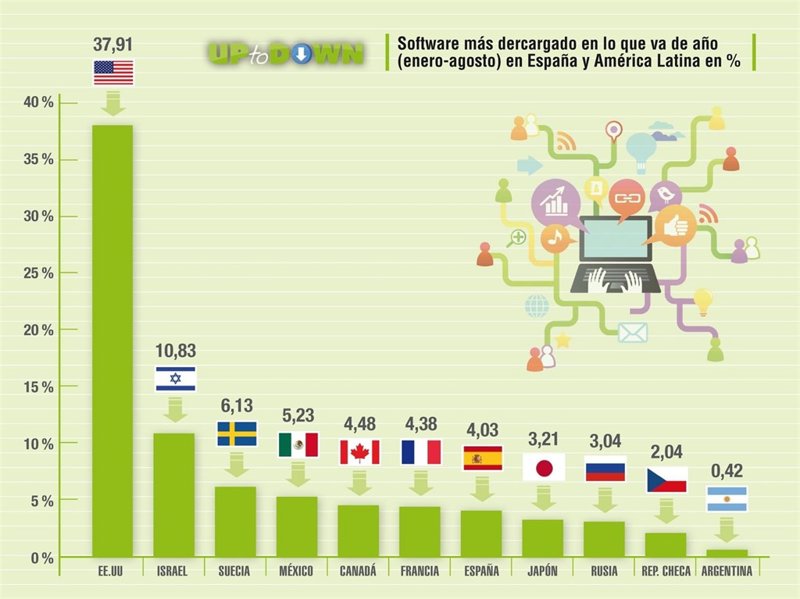 El informe ha analizado todas las descargas desde el portal en español de Uptodown.com entre los meses de enero y agosto de 2013. En el top 10 de los países que más software producen, de entre los usados por el internauta hispanohablante, también se han colocado países como Japón, Rusia y República Checa. También hay 2 programas chinos.