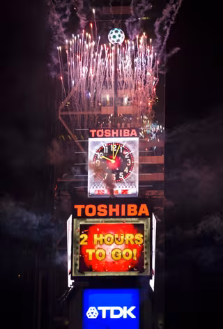 Toshiba Vision esa la pantalla gigante que se coloca en el edificio central que posee la firma en Times Square. Esta está situada justamente debajo de la gran bola que, desde 1907, cae tras la cuenta atrás que marca el inicio del nuevo año.