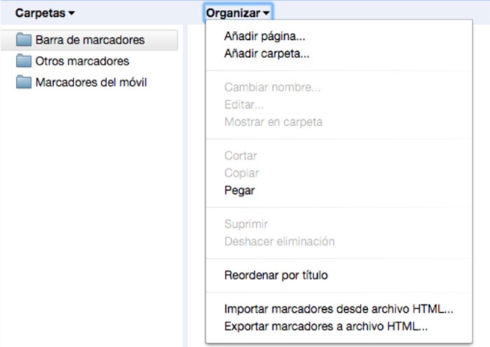 En Chrome debemos hacer clic en el icono de menú situado en la parte superior derecha, seleccionar 'Marcadores', 'Administrador de marcadores', y una vez dentro del administrador, hay que hacer clic en el menú 'Organizar'. Ahí tendrás la opción de 'Exportar marcadores a archivo HTML' y de 'Importar marcadores desde archivo HTML'.