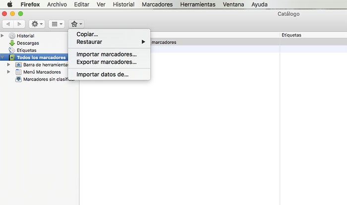 En el navegador de Mozilla la exportación e importación de marcadores es muy sencilla de hacer. Simplemente hay que abrir el navegador y hacer clic en la pestaña 'Marcadores', a continuación pulsar en 'Mostrar todos los marcadores' y en el botón con el icono de la estrella, que está situado más a la derecha en la barra de herramientas, podremos seleccionar 'exportar o importar marcadores' e incluso importar datos como el historial o contraseñas guardadas en los navegadores Chrome y Safari.