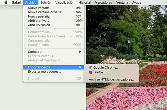 Exportar e importar en Safari es incluso más sencillo, si cabe. Abrimos el navegador Safari, hacemos clic en la pestaña 'Archivo' y nos encontraremos ipso facto con las opciones 'importar desde (Firefox, Chrome, archivo HTML de marcadores)' y 'exportar marcadores'.