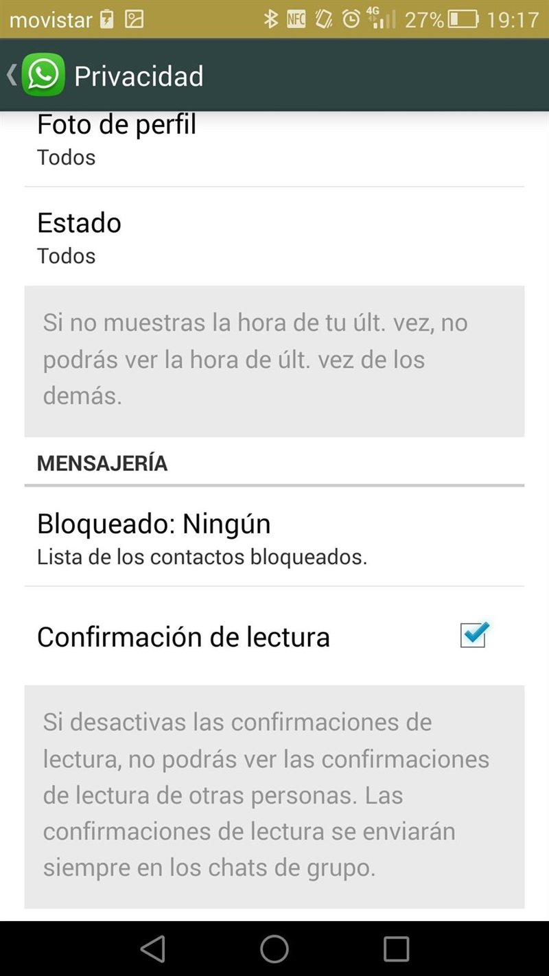 A partir de ese momento, los usuarios no podrán ver si sus mensajes se han leído, pero los demás tampoco podrán saber si el usuario ha leído mensaje o ha decidido ignorarlo. No obstante, el doble check azul continuará apareciendo siempre en los chats de grupo.