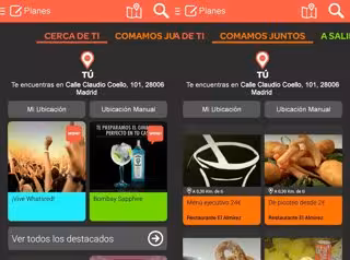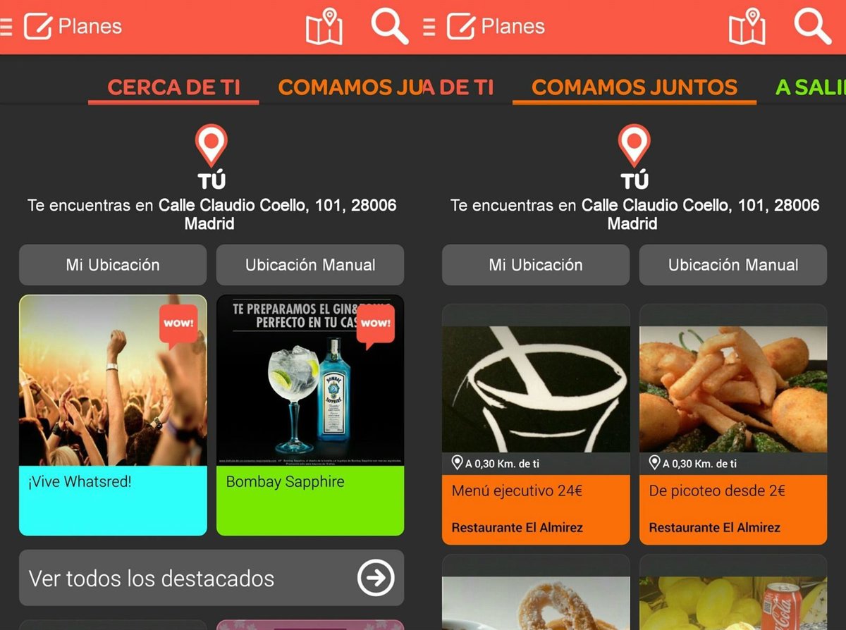 Lo principal en la aplicación Whatsred son los planes, por lo que en la página de inicio los encontramos agrupados por categorías y solo hay que deslizar hacia izquierda o derecha para navegar entre todas ellas, en función de nuestros gustos. Las secciones de planes disponibles son las siguientes: "Cerca de ti" (planes de todo tipo, en función de la ubicación), "Comamos juntos", "A salir", "Hacer deporte" y "Otros planes".