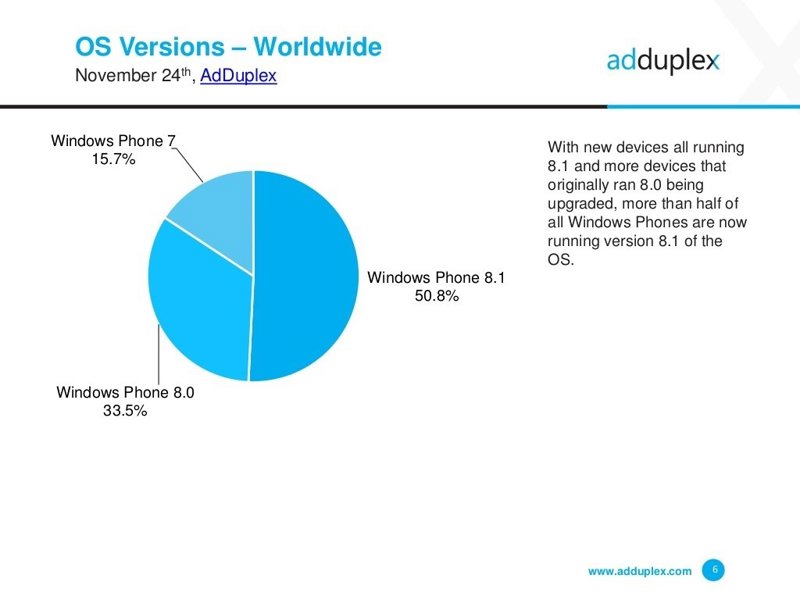 Windows Phone 8.1 ya está presente en el 50 por ciento de los dispositivos. En el mes de octubre había conseguido alcanzar el 46,7 por ciento de cuota de mercado y en este mes de noviembre la adopción ha experimentado una subida importante, llegando hasta el 50,8 por ciento. Son datos del informe estadístico de AdDuplex del mes de noviembre.