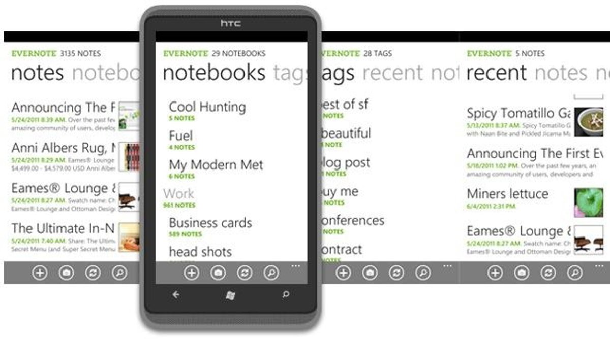 Evernote se ha convertido en la aplicación preferida para todos aquellos que quieren registrar un pensamiento o idea en cualquier sitio. El sistema permite clasificar las notas de los usuarios para que estén accesibles y se ha convertido en una especie de diario digital para muchos usuarios. La aplicación tenía versiones para ordenadores, para iOS y Android, y ahora también tiene una específicamente diseñada para Windows Phone 7.