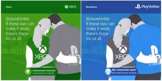 La imagen, con los colores corporativos de Xbox y personalizada por la marca, pronto encontró su analogía en versión para la consola de Sony, creada por un usuario de Play Station, demostrando que el amor es posible entre consolas.