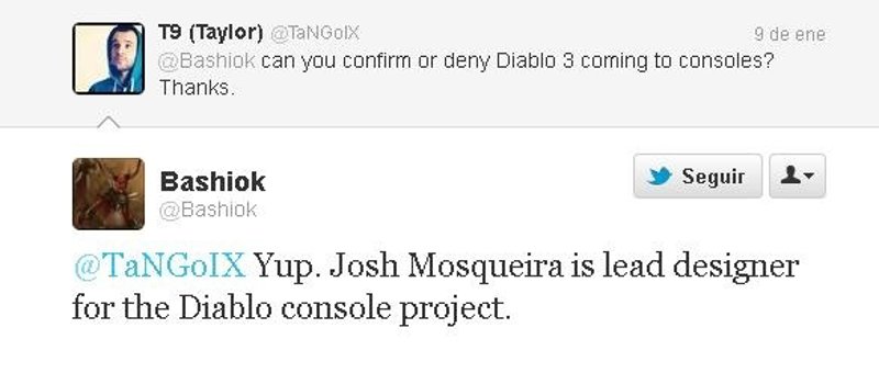 La respuesta de @Bashiok a la pregunta ha sido: "Sí. Josh Mosqueira es el diseñador jefe para el proyecto de Diablo en consolas". Con este comentario, se confirma de forma oficial que Blizzard prepara una versión del juego para consolas. Según el puesto de trabajo que buscaba la compañía, todo parece indicar que PlayStation 3 y Xbox 360 serán las plataformas seleccionadas. Sin embargo, por el momento no hay fecha de salida ni más datos sobre el título.