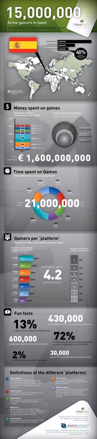 Si el dato del volumen de negocio de los juegos en España muestra el interés de los usuarios, el análisis del tiempo de consumo que efectúa Newzoo confirma las impresiones. Según la compañía, cada día, los 15 millones de jugadores españoles suman un total de 21 millones de horas.