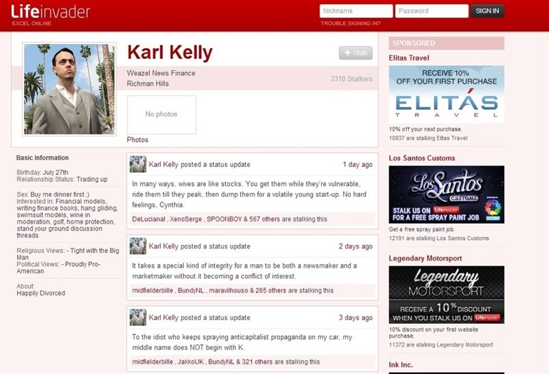 RockStar ha presentado Lifeinvider, la red social de Grand Theft Auto V. Se trata de una red social, muy similar al Facebook de la vida real, que muestra los perfiles de los personajes y marcas que aparecen en esta entrega del juego. También se podrá hacer clic en Me gusta a los contenidos que publiquen.