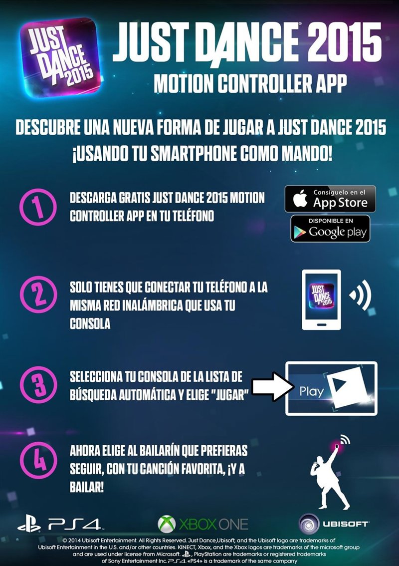 Ubisoft ha anunciado la disponibilidad de la 'app' móvil de Just Dance. Esta aplicación permitirá a los usuarios de Xbox One y de PlayStation 4 jugar a Just Dance 2015 incluso sin disponer de Kinect para Xbox One, cámara para PlayStation o el mando de movimiento PlayStation Move para medir el movimiento y puntuar el baile.