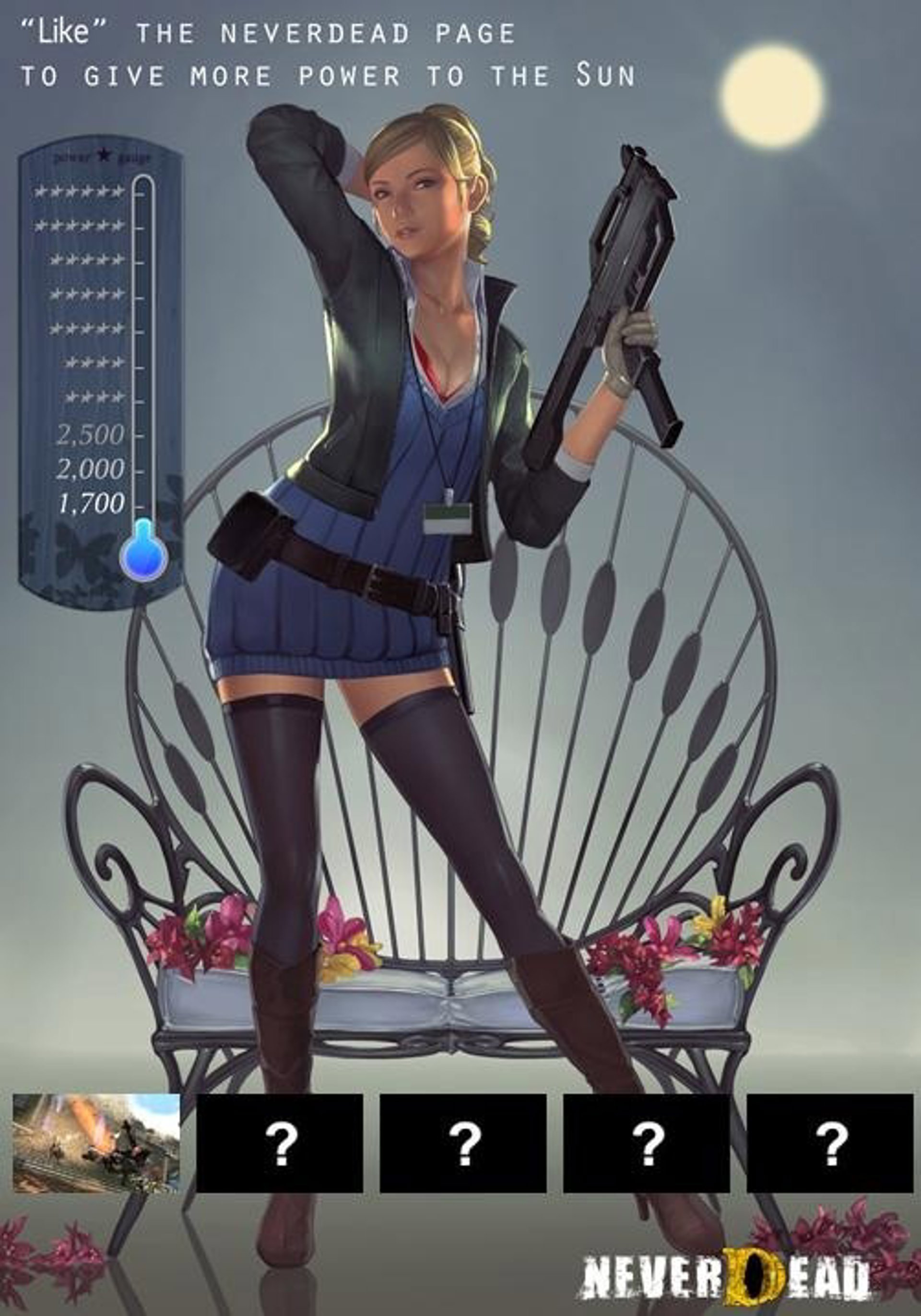 Konami ha puesto en marcha una llamativa campaña de publicidad para su nuevo juego 'NeverDead'. La compañía ha utilizado la imagen de la protagonista del juego, Arcadia, para atraer a los usuarios. En la página se puede ver una imagen de Arcadia y un dibujo de un sol. Cuando los usuarios dan al botón de 'Me gusta' en la página, el sol aumenta de tamaño. Desde Konami aseguran que con el aumento de calor la imagen irá cambiando.