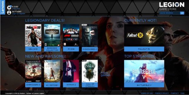 La web de Lenovo Legion Game Store ofrece un catálogo de más de 200 títulos totalmente terminados o en fase beta para ordenador, entre los que se incluyen Fallout 76, Battlefield V, Dead Cells y Frostpunk. La compañía ha afirmado que dispone de ofertas para determinados juegos, las cuales no están disponibles en otras tiendas.
