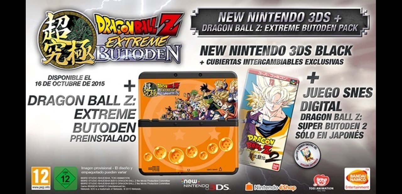 La nueva entrega de Dragon Ball Z se lanzará el 16 de octubre para Nintendo 3DS y New Nintendo 3DS. Para ir abriendo boca, Bandai Namco Entertainment Europa y Nintendo Europa han anunciado el pack exclusivo New Nintendo 3DSTM + Dragon Ball Z: Extreme Butoden, que contendrá: la consola New Nintendo 3DS negra, el juego preinstalado en la consola, unas cubiertas exclusivas de Dragon Ball Z: Extreme Butoden y el juego de SNes Dragon Ball Z: Super Butoden 2 (canjeable mediante código de descarga), lanzado para Super Nintendo en los 90.