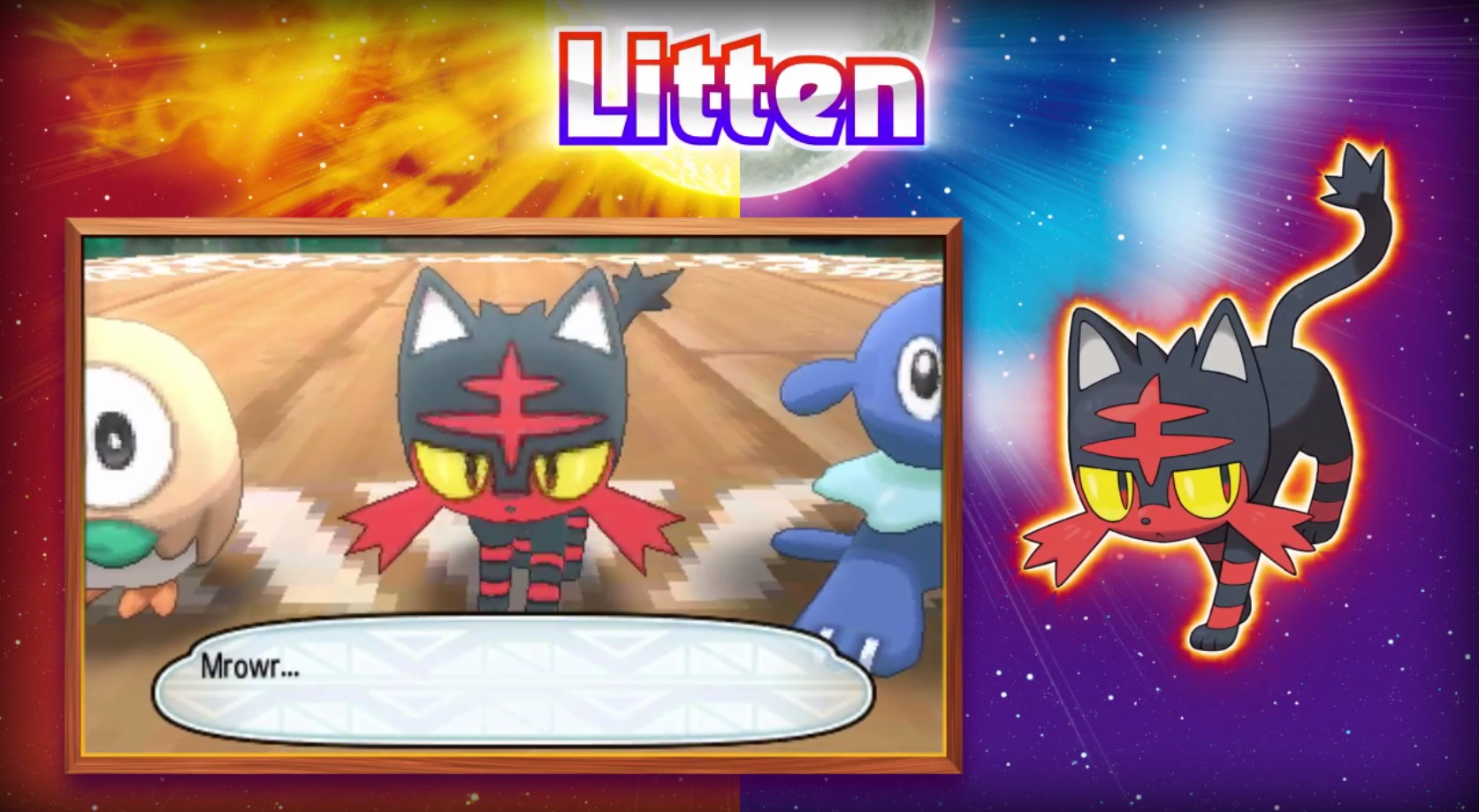 Litten, por su parte, es un Pokémon gato de tipo fuego. Se lame para acicalarse y luego prende las bolas de pelo que se forman en su estómago para atacar a sus adversarios con bolas de fuego. Cuando a Litten le llega la hora de cambiar su pelaje, le prende fuego y se produce un estallido de llamas monumental. Su movimiento incial es Ascuas.