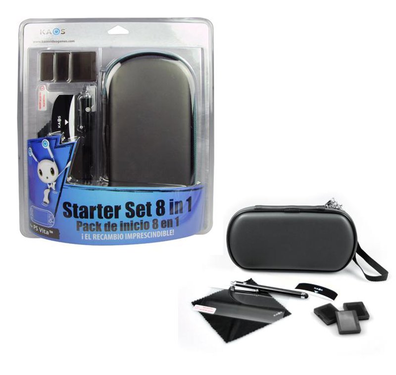 El primer pack de Kaos Videogames es el PS Vita Starter Set 8 en 1. Este kit incluye una bolsa de transporte para PS Vita y para juegos, una caja para guardar juegos y una tarjeta de memoria, un protector de pantalla, un paño de microfibra y una soft card. Sin embargo, lo que más destaca de este pack es que cuenta con un stylus para pantallas capacitivas. Se trata del primer stylus conocido para PS Vita, que podría aumentar su utilidad con futuras aplicaciones.