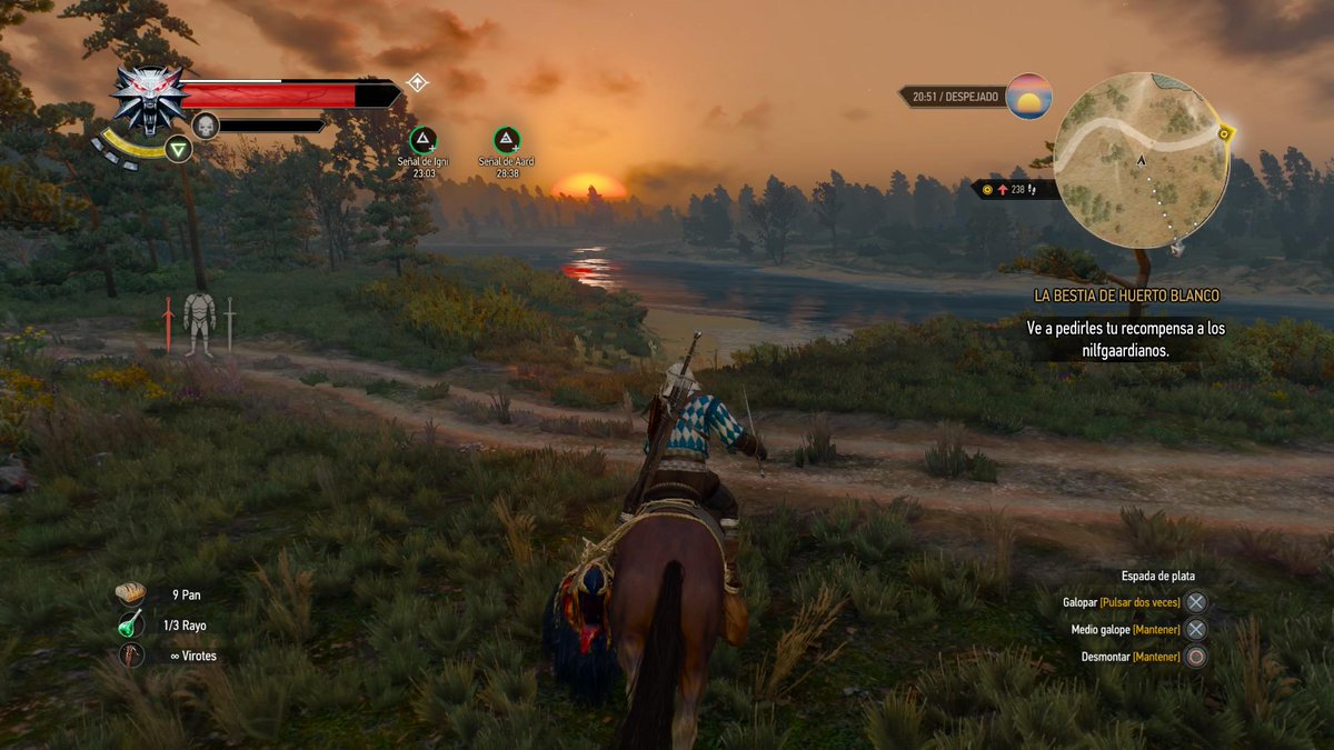 En cualquier caso, y para que esto no os pase, todos los rincones están plagados de objetos que podemos utilizar para mejorar las opciones de supervivencia de nuestro brujo. Desde armas y armaduras, hasta objetos para que nuestro querido caballo Sardinilla se asuste con menos facilidad si nos atacan. Por supuesto, hay decenas de ingredientes para preparar pócimas y ungüentos que, por ejemplo, aumentan el poder de una espada frente a determinados seres o nos permiten aguantar la respiración durante más tiempo debajo del agua. También encontramos elementos mágicos para mejorar las armas o los hechizos que Geralt es capaz de invocar.