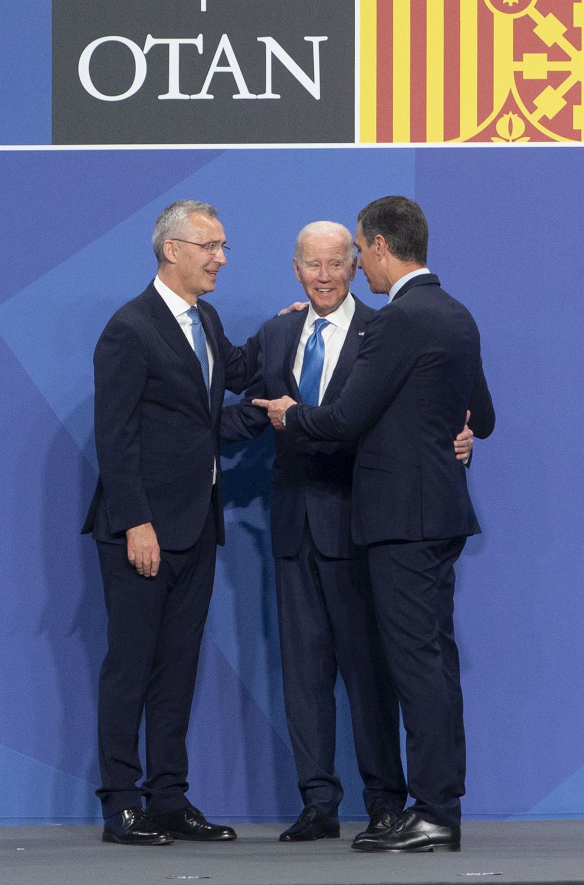 (I-D) El secretario general de la OTAN, Jens Stoltenberg; el presidente de EEUU, Joe Biden; y el presidente del Gobierno, Pedro Sánchez, a su llegada al comienzo de la Cumbre de la OTAN 2022 en el Recinto Ferial IFEMA MADRID - EUROPA PRESS/A.Ortega.POOL - Europa Press