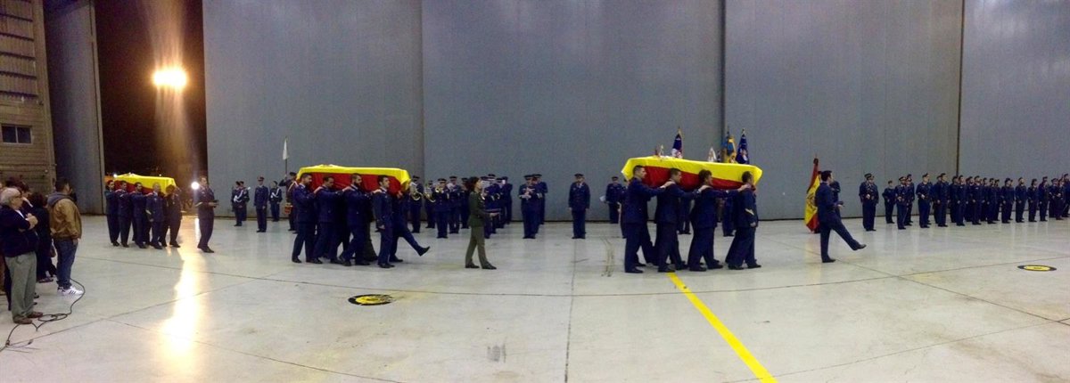 El ministro Morenés impuso a los tres militares la Cruz del Mérito Aeronáutico con distintivo amarillo a título póstumo. "Rindan homenaje a los que dieron su vida por España", resonó en el hangar acto seguido, continuado por una marcha militar y culminando con el himno español y los tres féretros a hombros de los compañeros de escuadrón para abandonar el lugar.