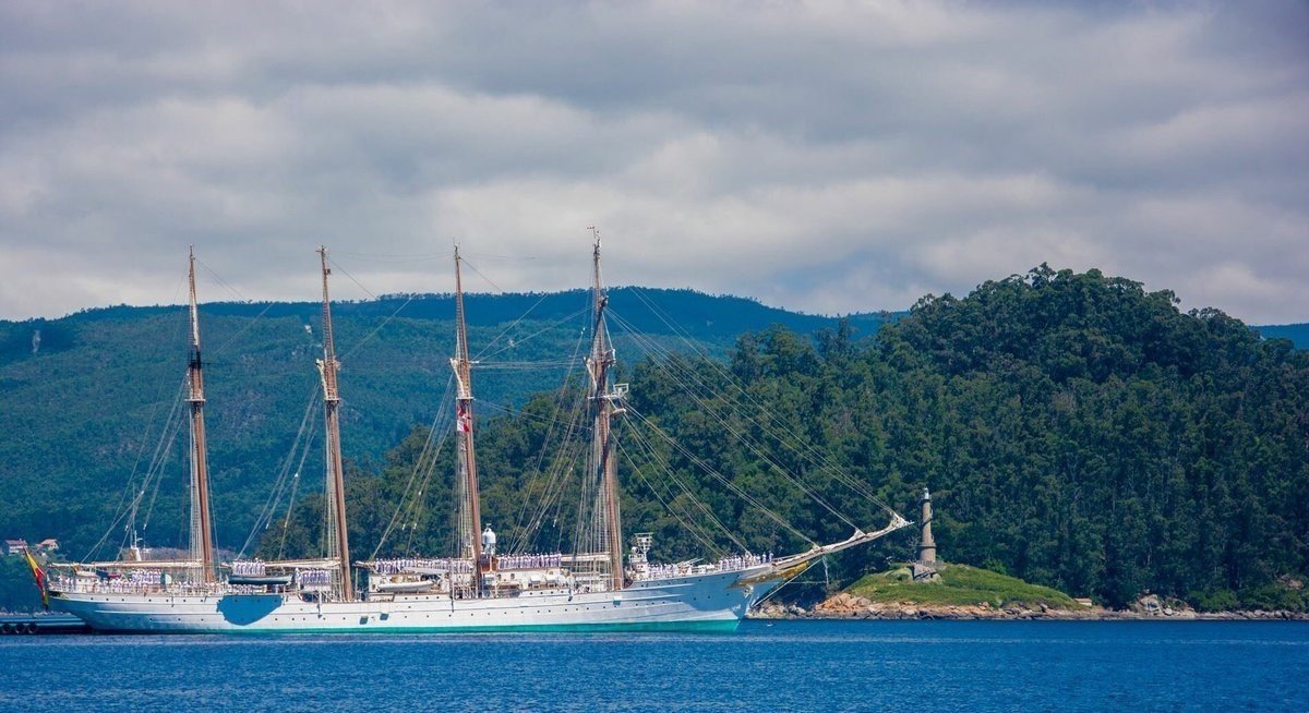 El buque-escuela 'Juan Sebastián de Elcano' atracó este miércoles en el muelle de Torpedos de la Escuela Naval Militar, en Marín (Pontevedra), para participar en los actos de celebración del Día del Carmen y la entrega de reales despachos a los alumnos del último curso de la Escuela Naval Militar.