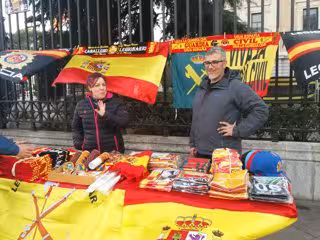 Alrededor de las 10.00 horas de la mañana apenas había público en las inmediaciones de la Plaza de Colón. En el lugar había algunos vendedores de banderas españolas y puestos de merchandising con objetos patrióticos, así como otro grupo que repartía banderas de la Unión Europeo.