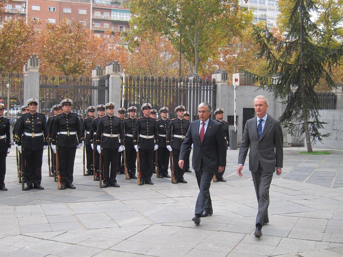 Morenés ha recibido con honores militares a las 12.00 horas a su colega portugués en la sede de su Departamento. Tras escuchar los himnos luso y español y pasar revista a la formación, ambos se han dirigido al interior del Ministerio para firmar la Declaración de intenciones para el refuerzo de la cooperación entre ambos países.